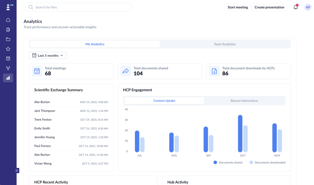 Our Beacon Hub feature provides HCPs and MSLs with the ability to collaborate, engage, and exchange information, in a shared, secure online space outside of actual meetings