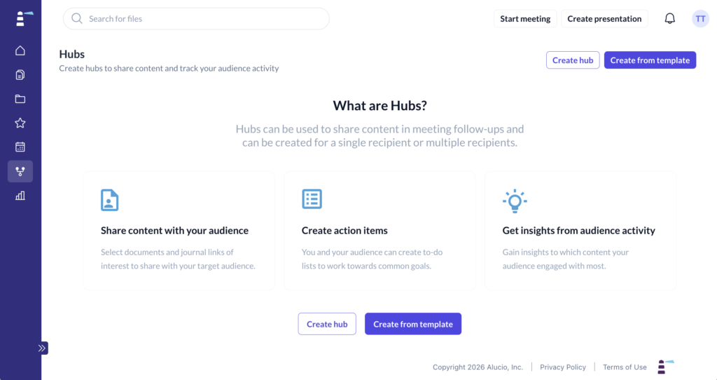Multiple Hubs can be created to support a variety of engagement models, from 1-to-1, 1-to-many, account-based, by topic, or by congress event