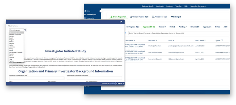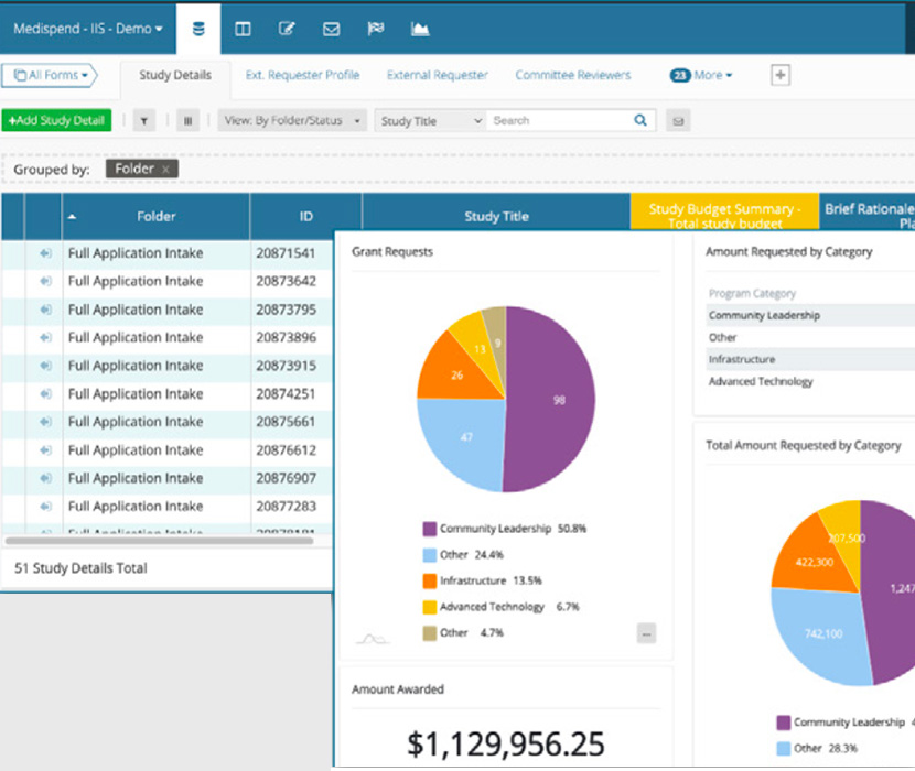 Within the grants/IIS management solution, Medispend offers Grants Management and Study Management to track every critical piece of your grant and investigator-initiated study (IIS/IIT) information exchanged between the applicant and your organization.